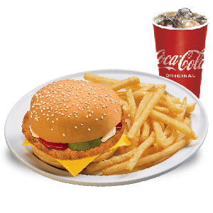 1 hamburguesa de pollo apanado con queso amarillo, papitas y soda mediana.