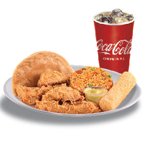 Combo especial para esos Grandes Apetito: 4 Chicken fingers, 1 empanada de harina de carne y 1 carimañola de pollo, acompañamiento regular (papas o arroz con vegetales) y soda mediana.
